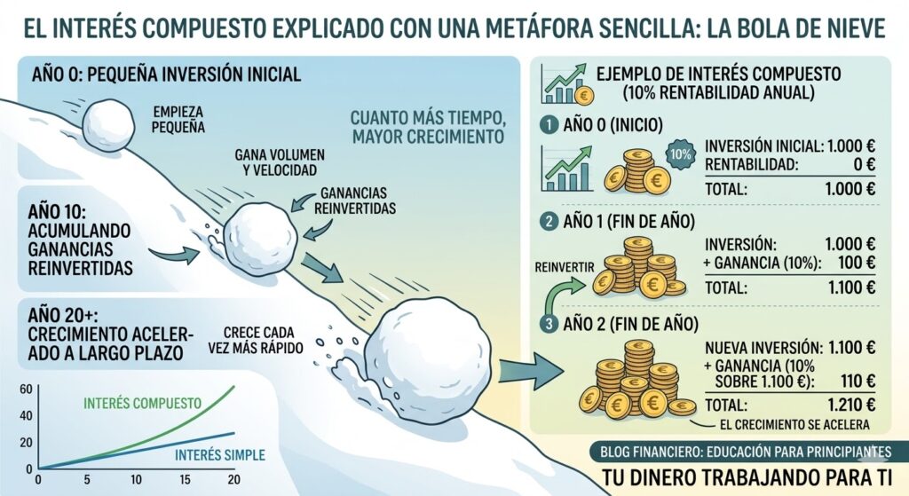 Una forma muy fácil de entenderlo es imaginar una bola de nieve rodando cuesta abajo. Al principio empieza siendo pequeña, pero a medida que avanza va acumulando más nieve y cada vez crece más rápido. Con el interés compuesto ocurre algo similar: cuanto más tiempo permanezca tu dinero invertido, mayor será el crecimiento.