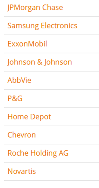 Este tipo de ETF incluye empresas conocidas a nivel mundial que destacan por pagar dividendos. Algunas de las principales compañías dentro de este fondo pueden ser: